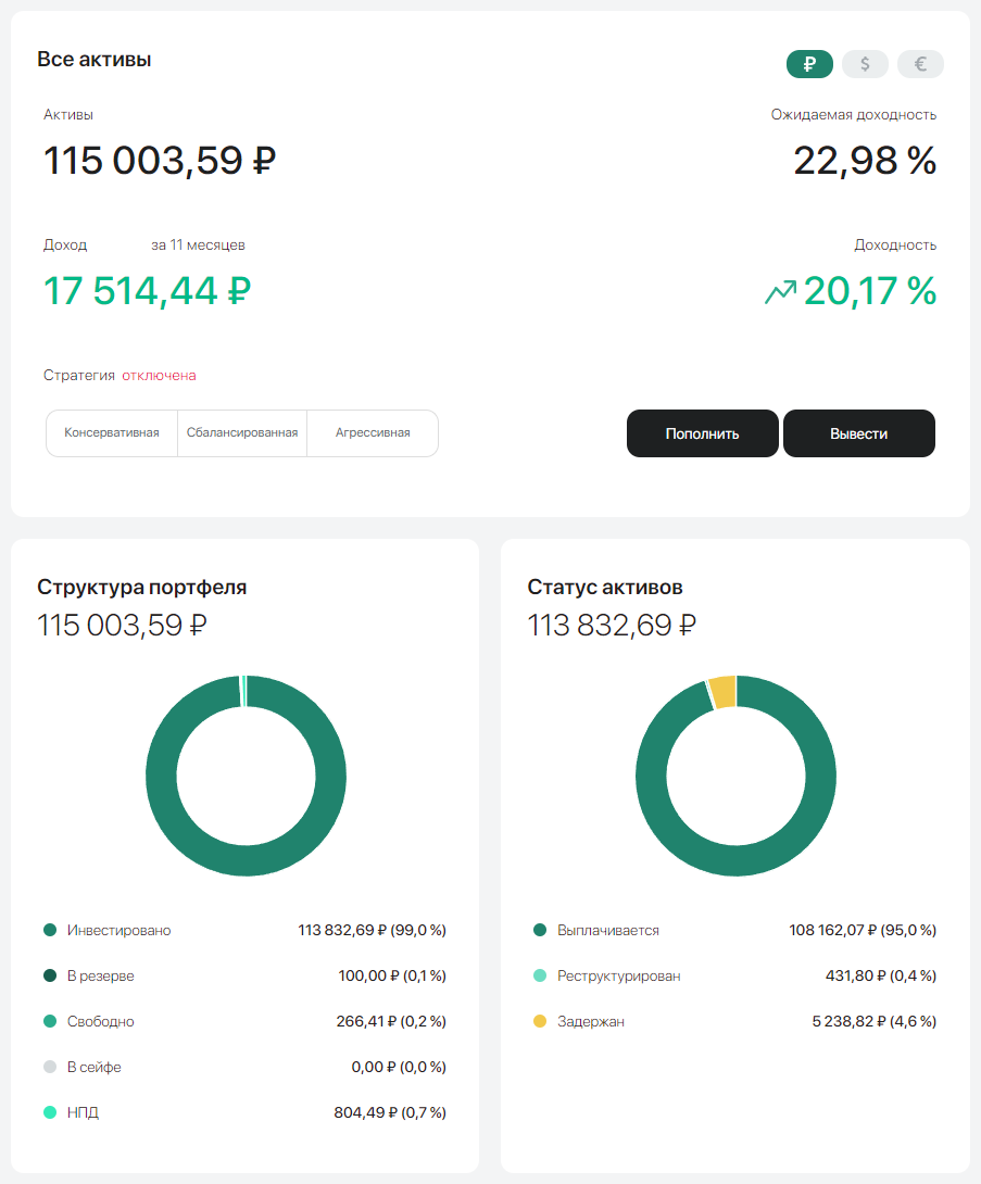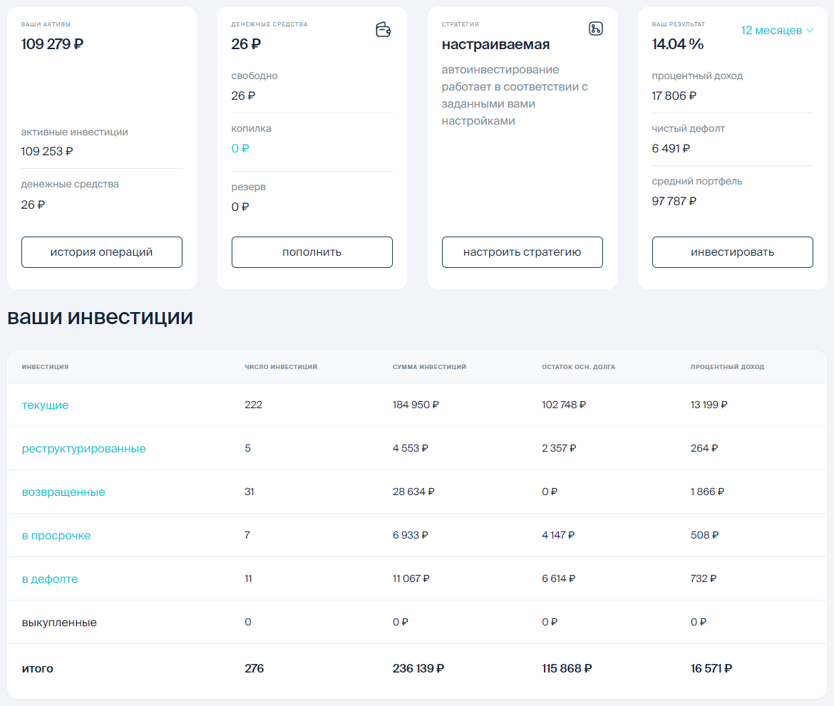 | Активы, руб. | Дефолты, % | Деньги, % | Доход за 1 мес., % | Доход за 12 мес., % г. | Займы, шт. | Дефолты, шт. | |
