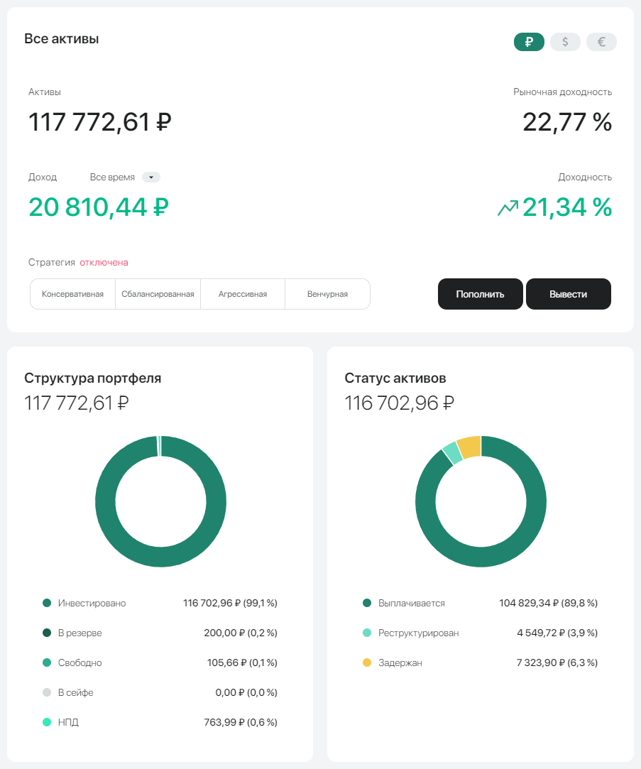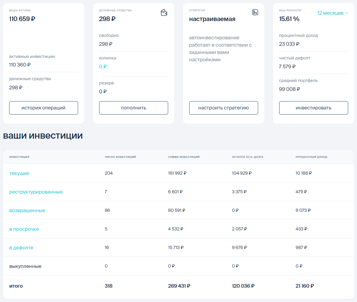 На обеих платформах инвестирование прекращено, ожидаю возвращение всех займов, без их продажи, чтобы посчитать реальную доходность.